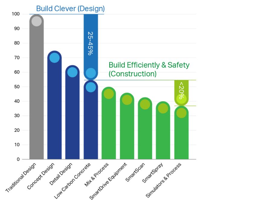 Beim Tunnelbau in offener Bauweise wird Spritzbeton weltweit eingesetzt, und in vielen Ländern der Welt hat er sich aufgrund seiner hohen Qualität auch für permanente Tunnelauskleidungen durchgesetzt, die zwischen 20 und 25 % des Betons einsparen, der bei herkömmlichen Tunnelauskleidungen verwendet wird. Ich bin davon überzeugt, dass moderne Spritzbetonsysteme, die einen hohen Anteil an Portlandzementersatz, Polymerfasern und innovative Abdichtungssysteme kombinieren, heute Möglichkeiten bieten, den Kohlenstoffgehalt in unseren Tunnelauskleidungen um mehr als 50 % zu reduzieren. Aber auch hier gilt, dass diese 'Build Clever'-Lösungen bereits in der frühen Planungsphase erfasst und umgesetzt werden müssen, um das größte Kohlenstoffeinsparungspotenzial auszuschöpfen. Dies sind echte Lösungen, die zu echten Einsparungen führen, und mit der richtigen Teamkultur, dem richtigen Design und in Verbindung mit aufregenden neuen Beschaffungsmodellen, die positive Dinge erzwingen, können wir diese großen Schritte heute machen.