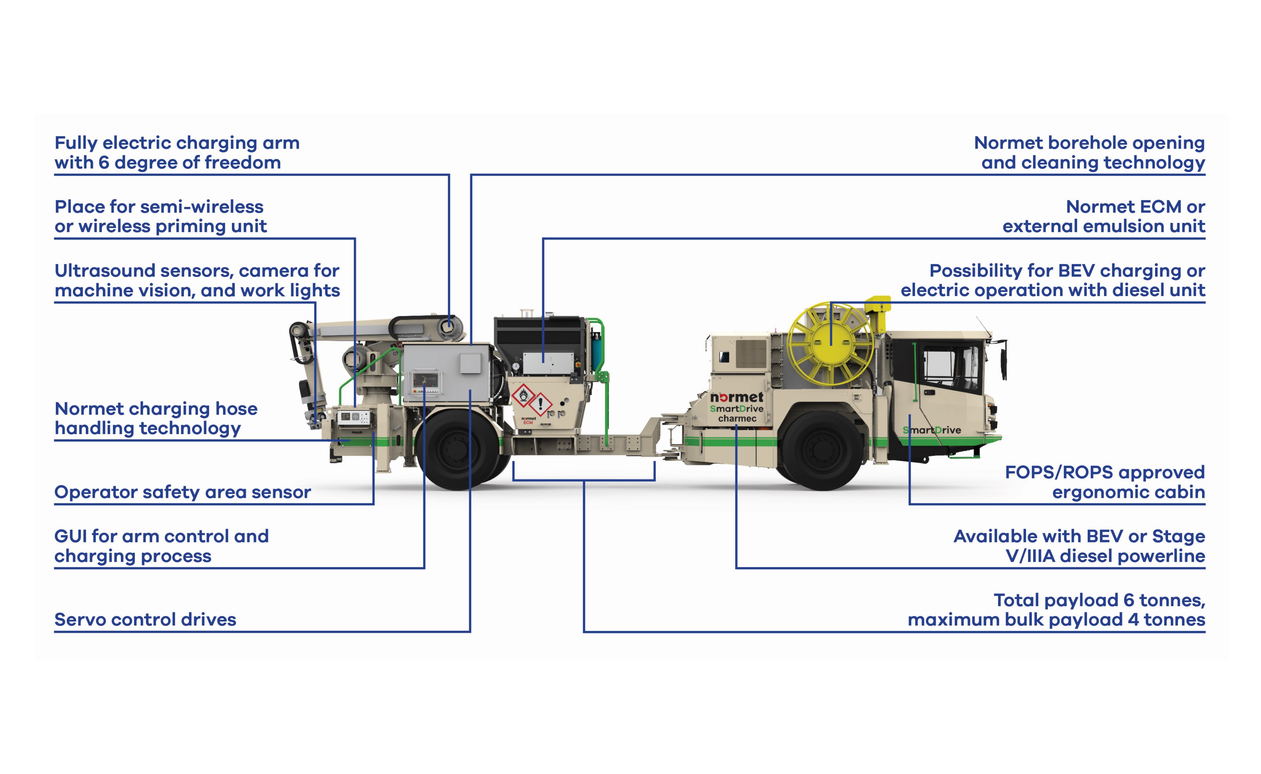 La plataforma Charmec Revo es el portador de cabina delantera de última generación disponible con la última clasificación de emisiones del motor diesel o con la arquitectura eléctrica de batería SmartDrive con cero emisiones locales. La capacidad de carga de Charmec Revo es de 6000 kg, lo que significa hasta 4000 kg de capacidad de matriz montada de forma segura en la plataforma trasera lejos de las superficies calientes. Una gran capacidad de carga reduce la necesidad de ir y venir entre los lugares de carga y el almacén de explosivos, lo que aumenta significativamente la productividad y ayuda a mantener la máquina de carga en buenas condiciones.